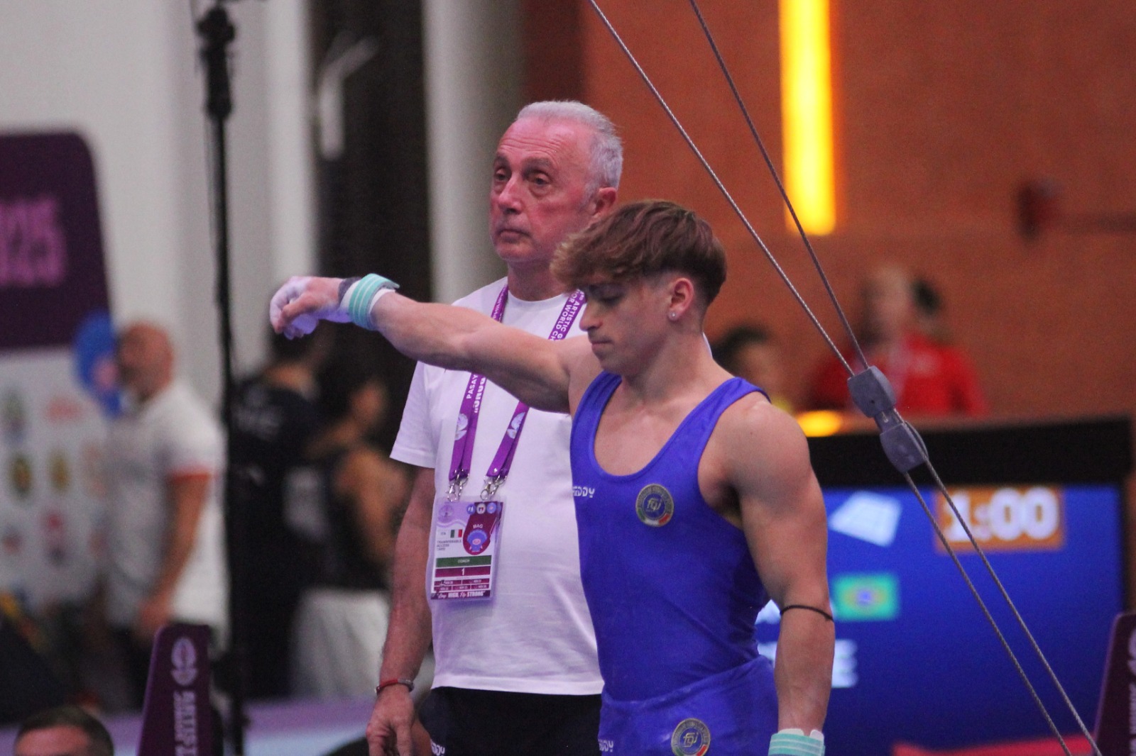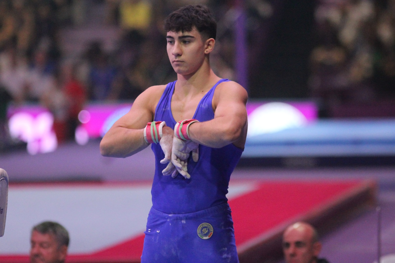 La finale dei due ginnasti italiani è iniziata con Simone impegnato al cavallo e Ricky alle parallele. Notoriamente punto debole del ginnasta siciliano, le maniglie gli regalano un buon 12.300 (4.000 - 8.300) che lo tiene a contatto con il resto della truppa. Riccardo fra gli staggi pari fa un po’ meglio del compagno e piazza un discreto 12.666 (4.400+8.266). Il giro successivo è quello che lancia in orbita Speranza. Il nuovo “signore degli anelli”, e non ce ne vogliano i vari Chechi, Morandi, Coppolino, Angioletti, Lodadio e Maresca, esibisce una prestazione spaziale che le giurie premiano con uno straordinario 14.100 (5.000 - 9.000). Dopo la “stoppata” arriva anche il decimo di abbuono assieme allo scrosciante applauso della Marriott Grand Ballroom, che oltre al beniamino di casa Yulo ha adottato anche il nostro portacolori. Ruggeri alla sbarra esegue un esercizio di buona qualità ed ottiene punti 12.600 (4.500 - 5.100). Al volteggio Simone mette la freccia. Nonostante un’uscita di pedana che gli costa tre decimi di punto, il 13.566 (4.800 - 9.066) lo fa schizzare nei piani alti della classifica. A metà gara Speranza è addirittura quarto (39.966), alle spalle di Wang, Dukhno e Ojima, ma davanti a tutto il resto del mondo giovanile. Ironia della sorte, al corpo libero, Ruggeri ottiene lo stesso identico punteggio del connazionale, 13.566 (5.200 - 8.366) e arriva toccare la 12ª posizione della generale provvisoria.